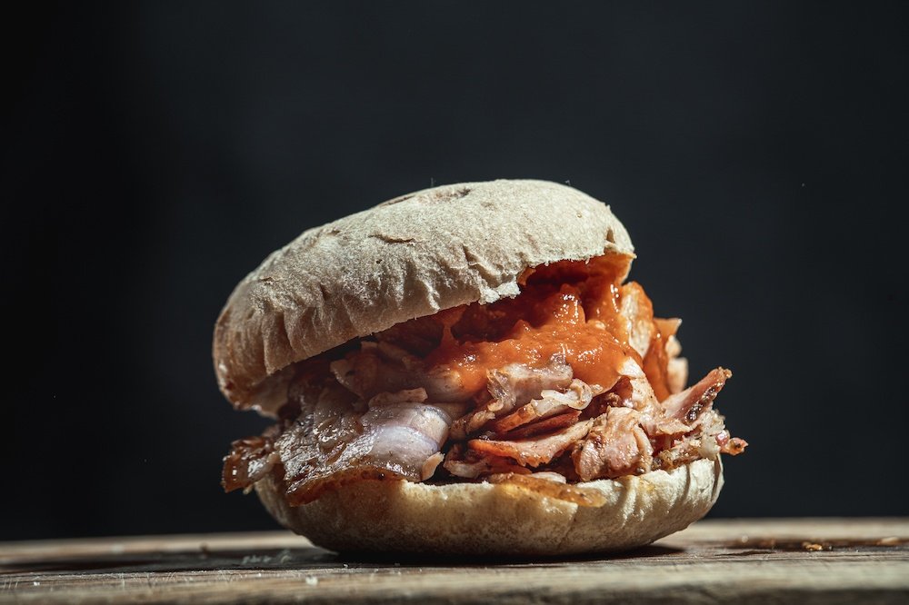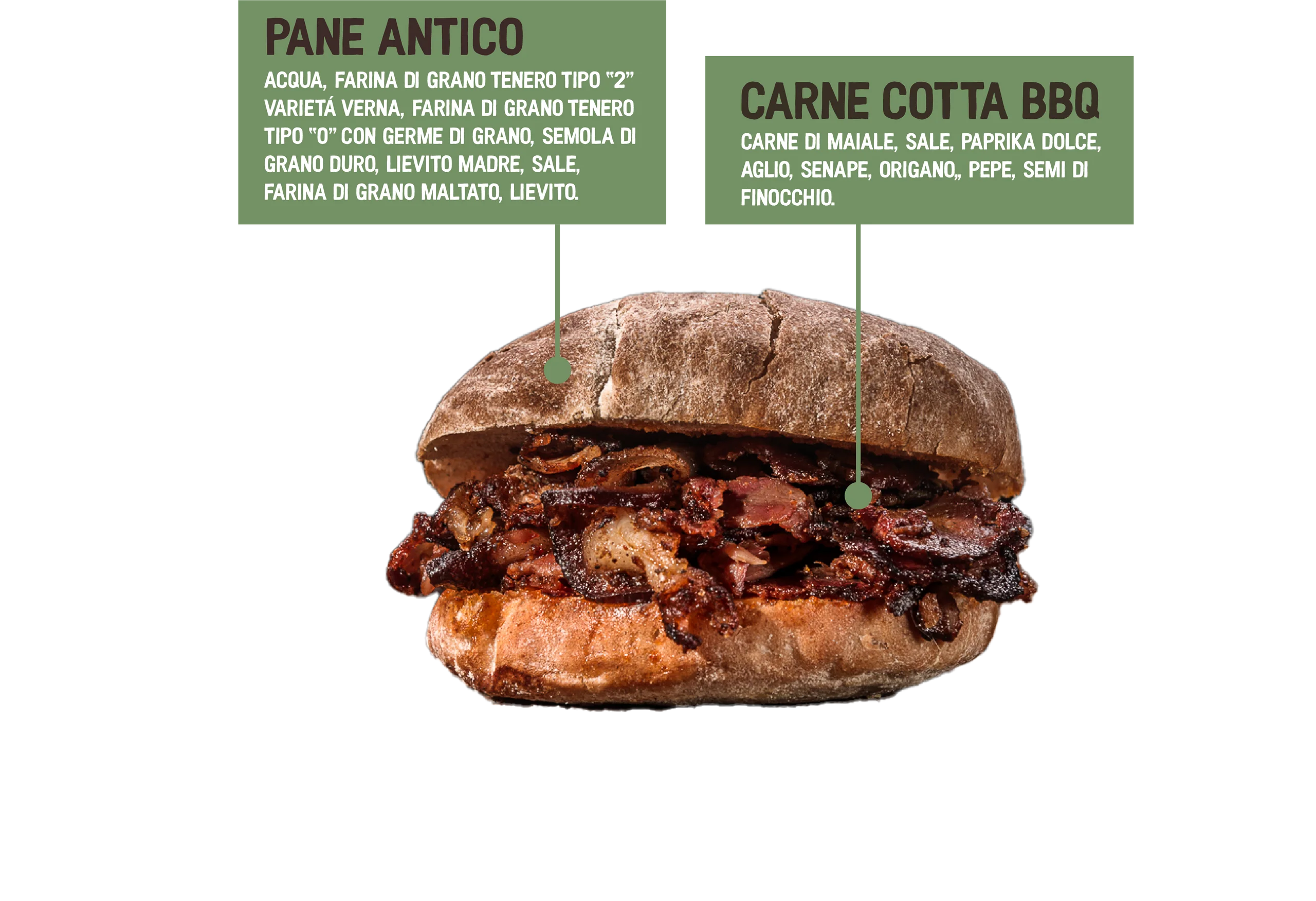 Farcito di fettine, pezzetti e sfilaccetti di carne di maiale pregiata allevato all’aperto, prima leggermente affumicata con legno di melo e ciliegio, poi marinata e infine cotta 18 ore al barbecue. Il pane è realizzato con grano antico Verna macinato a pietra.